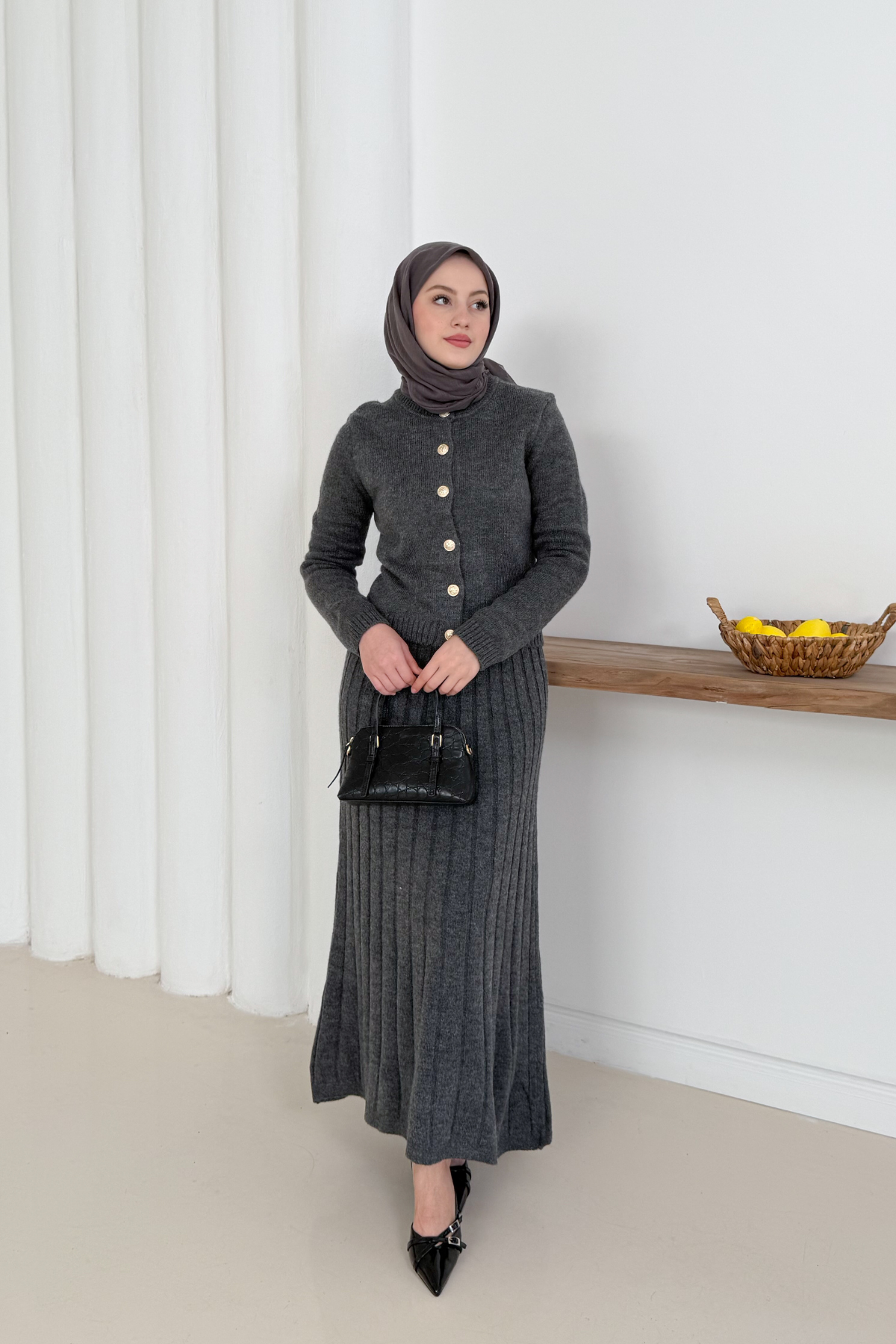 Premium dokusu, gold ve gümüş düğme detaylarıyla öne çıkan bu triko takım, konfor ve şıklığı bir arada sunuyor.