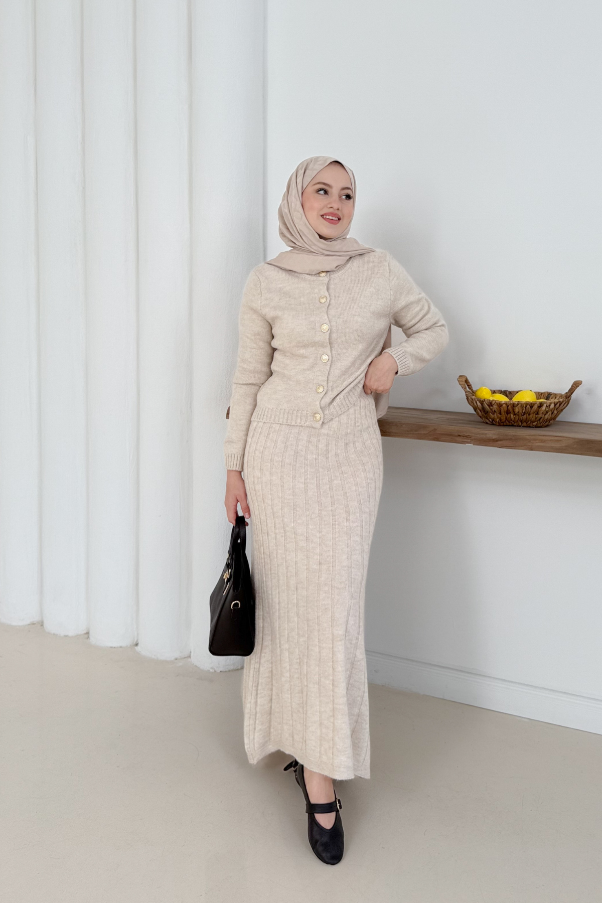 Premium dokusu, gold ve gümüş düğme detaylarıyla öne çıkan bu triko takım, konfor ve şıklığı bir arada sunuyor. 1-2 beden Üst boy: 45 cm Alt boy: 110 cm'dir. Manken 1 bedendir.