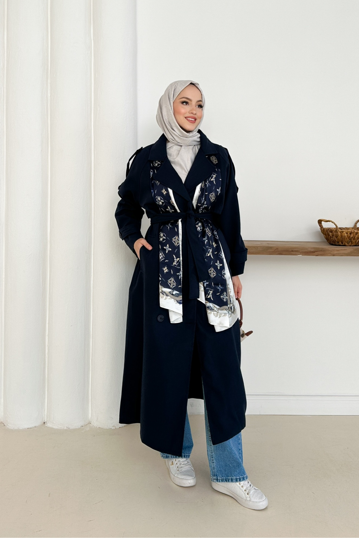 Rahatlık ve şıklık bir arada. Akıcı formu, sade çizgileriyle asil bir görünüm sunarken, zarif duruşuyla fark yaratıyor. Fular detayı ve uzun boyuyla bu trench, her sezonun kurtarıcı parçası olmaya aday.