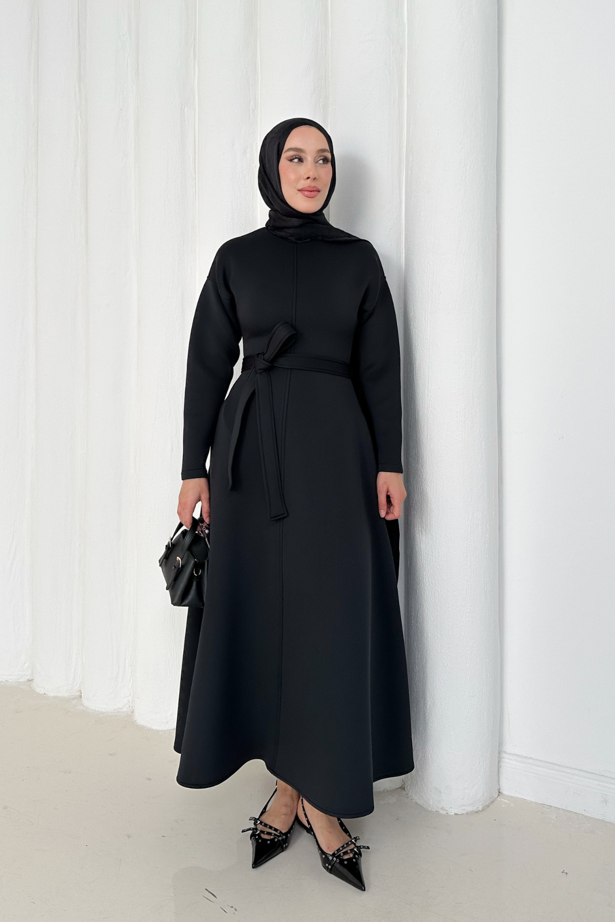 Esnek scuba kumaşı ve zarif kemer detayıyla tasarlanan bu elbise, modern kesimi sayesinde hem rahat hem şık bir görünüm sunuyor.