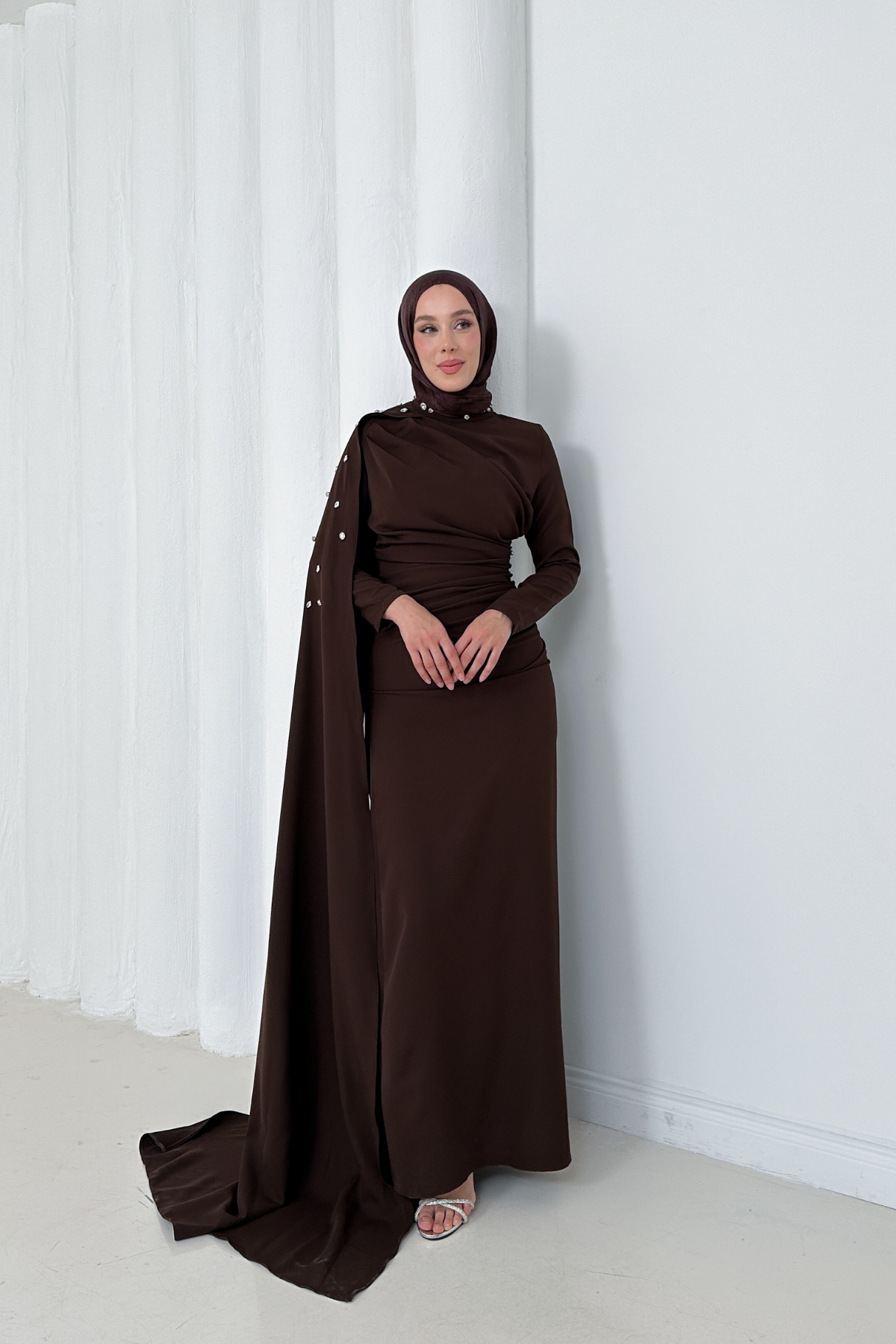 Işıltılı taş detayları ve şık pelerin tasarımıyla bu elbise, özel günlerinizde sizi her zamankinden daha ayrıcalıklı hissettirecek.