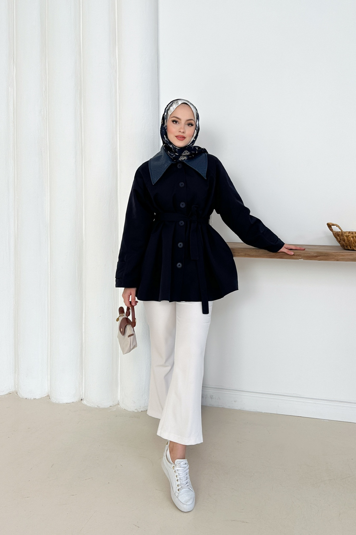 Klasik trench formuna modern bir dokunuş. Deri yaka detayıyla stilinizi öne çıkaran ara boy trench, zarafeti ve rahatlığı bir arada sunuyor.